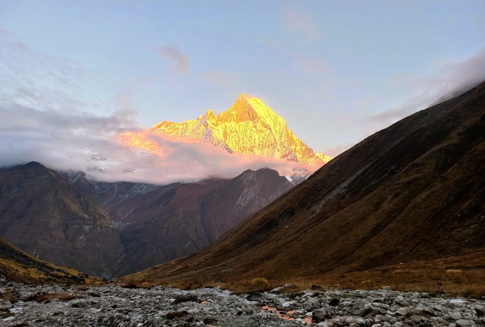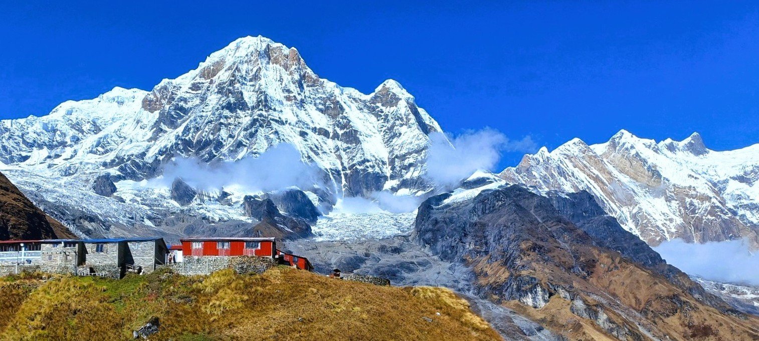 Today marks one of the most exhilarating days of the trek as we ascend into the heart of the Annapurna Sanctuary. The trail begins with a steady climb through alpine terrain, where the forest thins and the landscape becomes more rugged and dramatic. After 2–3 hours, we reach Machhapuchhre Base Camp, nestled beneath the sacred, unclimbed peak of Machhapuchhre (Fishtail). From here, the views are truly spectacular; Annapurna South (7220m), Hiunchuli (6441m), Gandharva Chuli (6248m), Annapurna Fang (Haraha Shikhar)(7647m), and Annapurna III (7555m) rise around you.